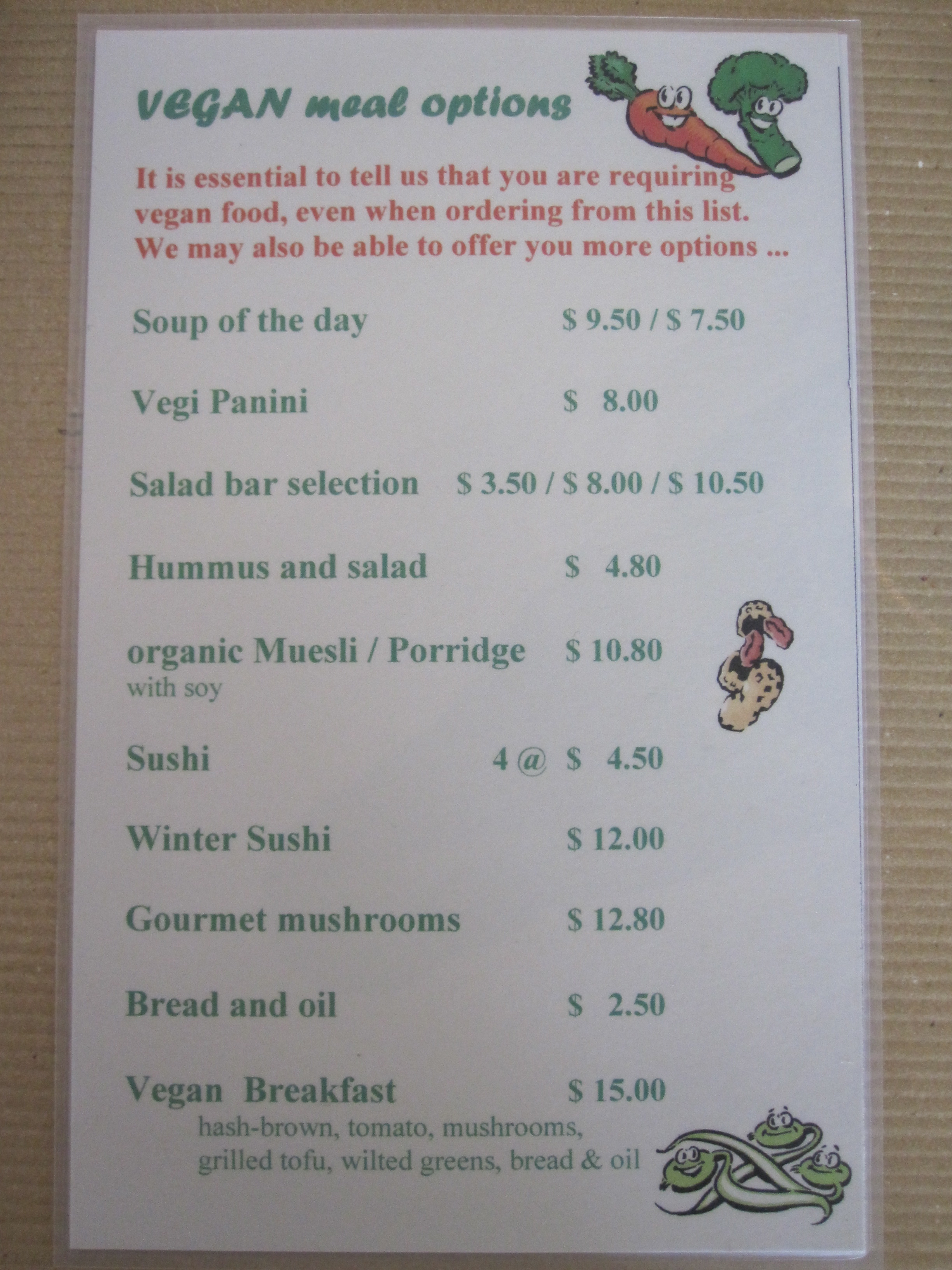 Midnight Espresso Bar 178 Cuba Street The tofu burger is of legend so we asked if we could get a low fat version w/o the oils/vegan mayos, etc. They said “we”ve got a whole kitchen full of food we”ll make you what ever you like” and they did! High marks too for the vegan soy hot chocolate!